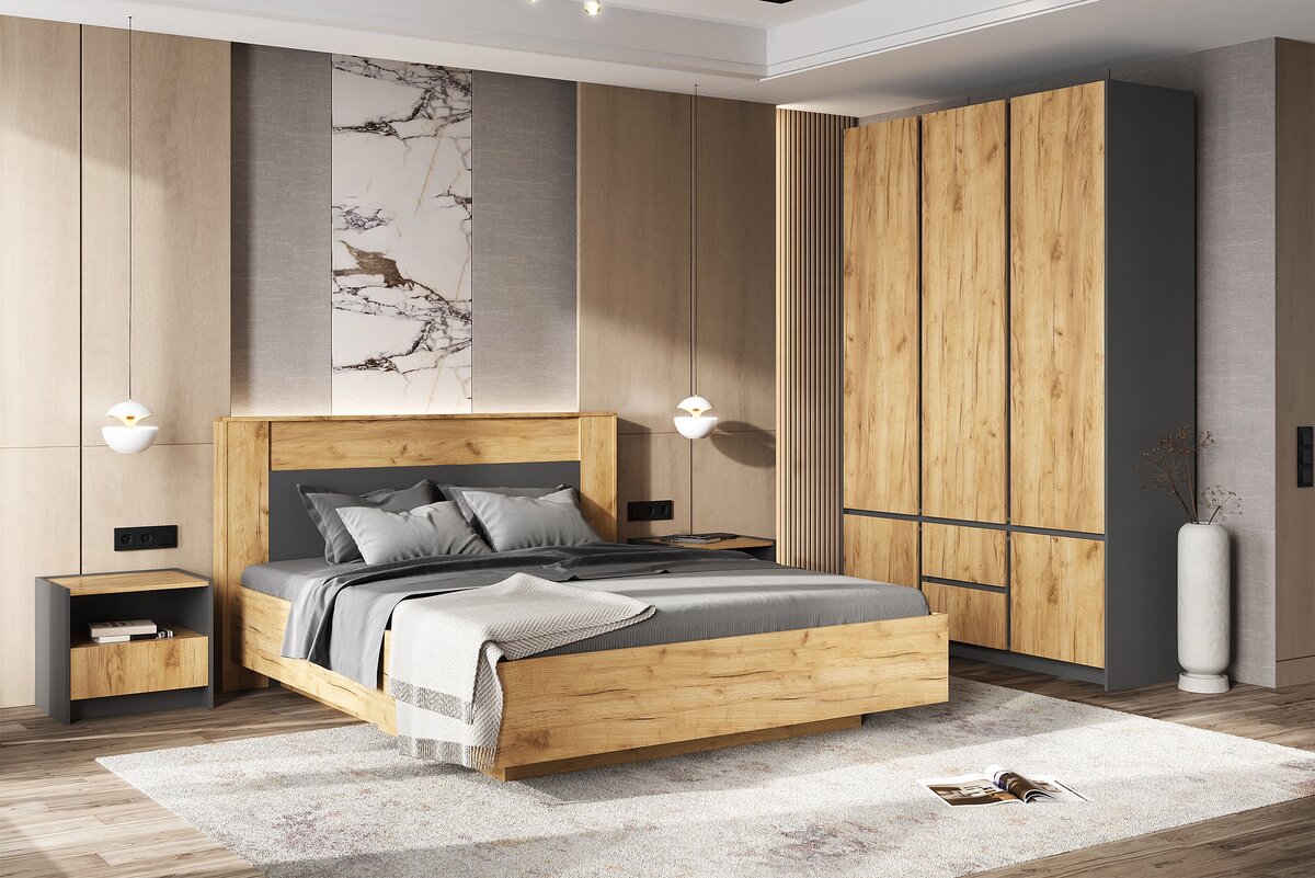 - Для спальни — кровать с мягким изголовьем, прикроватные тумбы без лишнего декора и спокойный текстиль.
