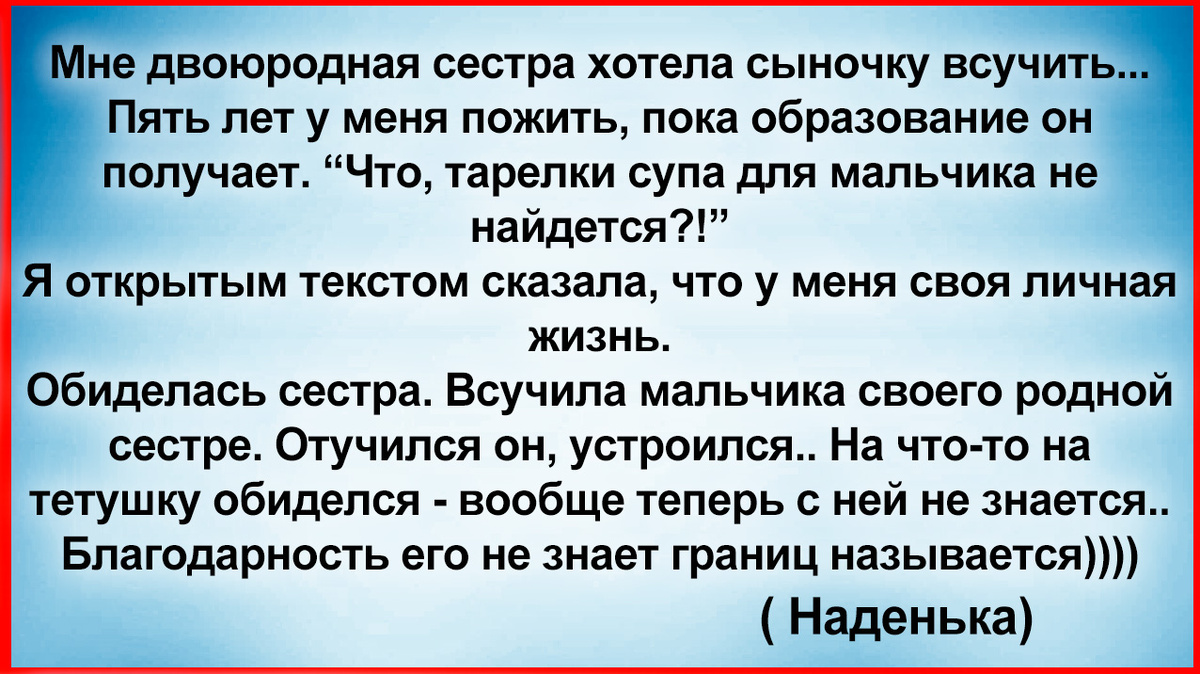я тут вызверилась и говорю " тёть, когда я мать лечила, когда брата я одна хоронила, когда мать я одна хоронила, никто мне ни копейкой не помог, когда я одна осталась без денег , кто мне помог? А ? И вы прекрасно знали об этом. Никто даже не попытался спросить как у меня дела и не нужна ли мне помощь . А теперь значит родственники?!? Нет.