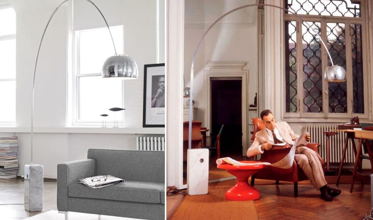 Светильник Arco стал символом эпохи. Мраморное основание, изогнутая стальная дуга, алюминиевый плафон. Простая идея — торшер, который светит как люстра, но не требует крепления к потолку.