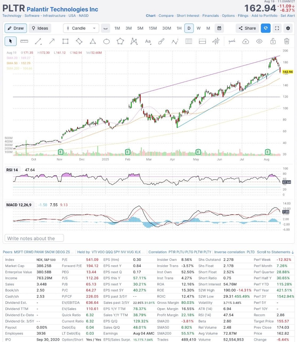 🔥Падение акций Palantir #PLTR: что стоит за снижением? Акции Palantir Technologies #PLTR упали на 12% от рекордного максимума, снизившись на 6% до 163,75 долларов. Несмотря на это, они выросли на 117% в 2025 году. Короткий продавец Эндрю Лефт из Citron Research ставит на дальнейшее снижение из-за высокой оценки компании. Palantir выиграла на ожиданиях роста правительственного бизнеса в США и энтузиазме по поводу ИИ, хотя коммерческие доходы не увеличились. После рекордного максимума 12 августа наблюдается отток из акций ИИ. CoreWeave #CRWV также снизилась после IPO и отчетности, потеряв 5% до $91. CoreWeave арендует GPU-серверы у NVIDIA #NVDA. Рейтинг относительной силы акций Palantir — 98 из 99, а рейтинг накопления/распределения — B+. Это указывает на высокую волатильность и необходимость новой базы для роста. Вывод: Снижение акций Palantir вызвано корректировкой на фоне высокой оценки и ожиданиями. Долгосрочный потенциал в ИИ сохраняется, но возможна волатильность. #акции #ин