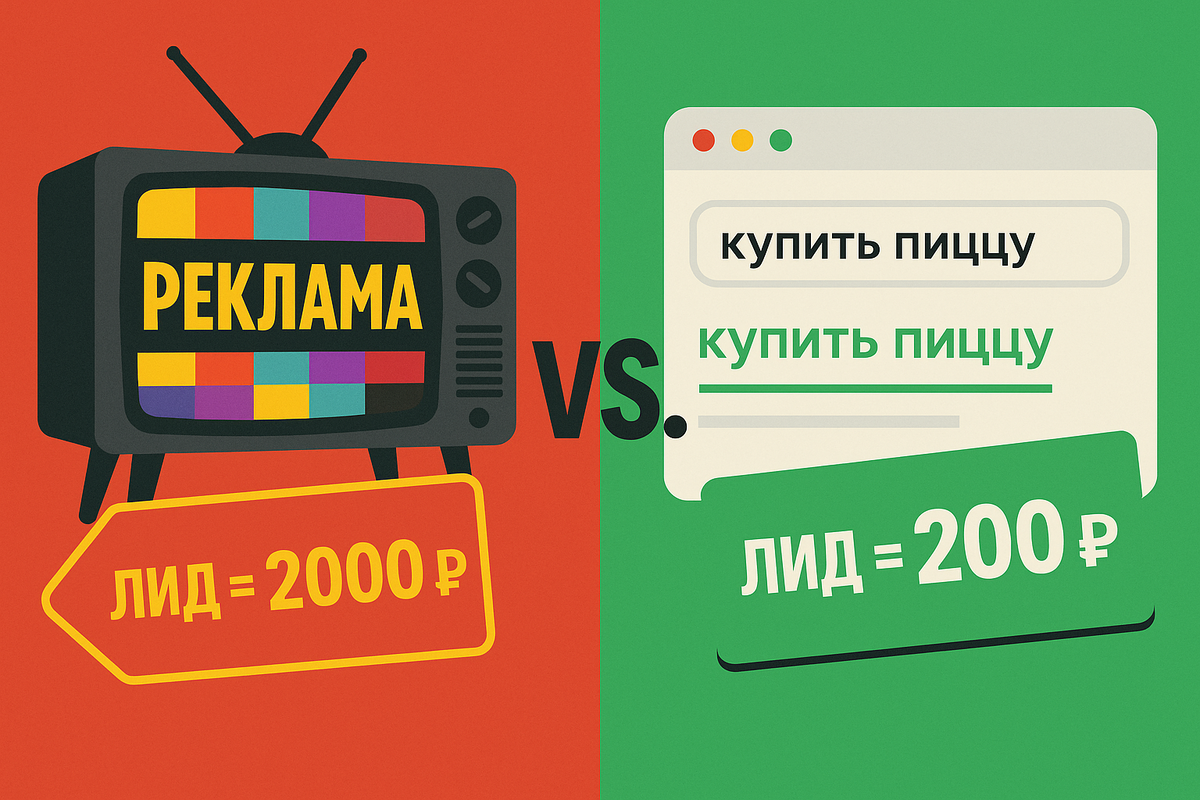 Два одинаковых бизнеса. Первый покупает эфир и билборды, платит ежедневно и каждый раз заново «подымает волну». Второй вкладывается в сайт и контент. Старт медленнее, зато со временем заявки идут сами, без постоянных доплат за показы. Наша статья про разную экономику каналов. В классической рекламе вы обращаетесь к тем, кто ничего не искал. Показали пиццу тысяче человек. Купят, в лучшем случае, два десятка. Остальным не надо. В поиске все наоборот. Человек сам набирает «заказать пиццу». Значит, он голодный и готов платить. Поэтому конверсия из показа в заявку заметно выше, а цена обращения ниже. По ориентировочным оценкам: — ТВ: 500–2000 ₽ за лид. — Наружка: 300–1500 ₽. — SEO: 100–500 ₽, а через год при стабильной работе цена часто падает к ~140 ₽. Диапазоны зависят от ниши и региона, но порядок понятен: тёплый спрос дешевле холодного. Есть еще один важный момент! За органический трафик не нужно платить каждый день. А реклама с каждым годом становится дороже, и это естественно с