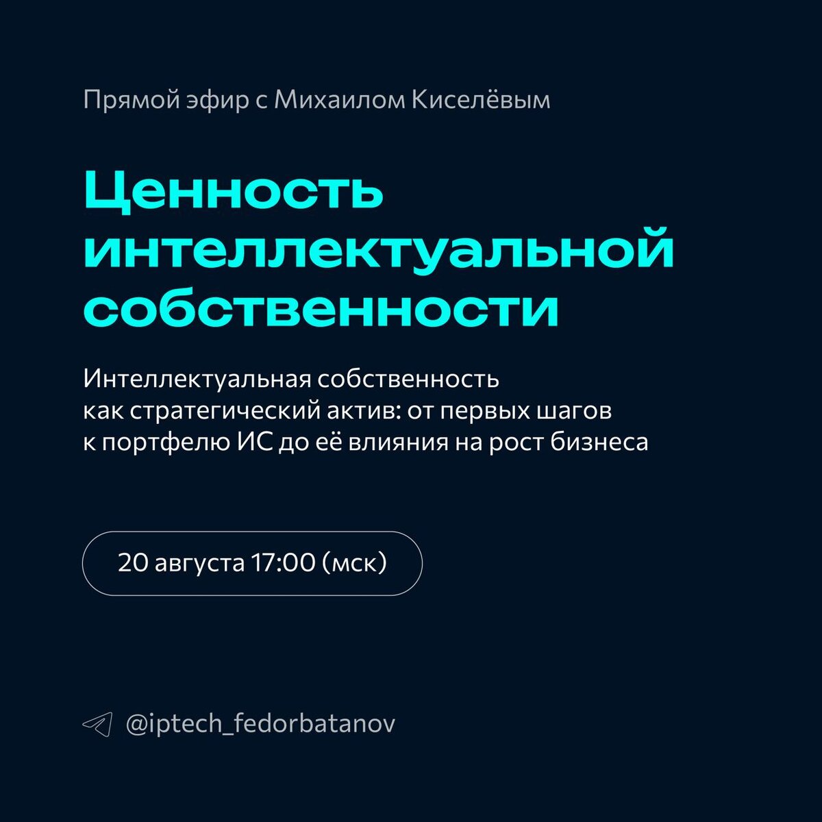 👀 Готовим на завтра прямой эфир про ценность интеллектуальной собственности с Михаилом Киселёвым