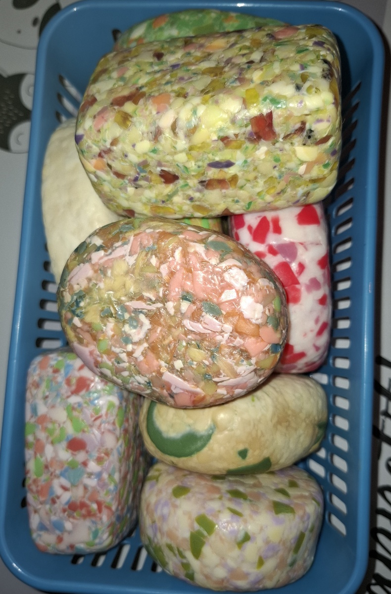 Всем привет! Сделала несколько новых залипушек,спешу поделиться с вами) Одну решила сделать просто беленькую,зелёная уже от резки разных залипушек, а белый брусочек с красным и сиреневым,похожий на большой лукум,ооочень вкусно пахнет) Эти залипушки крупненькие,все три от резки других залипушек,так сказать уже третья жизнь мыла) Верхнюю слева сразу порезала,на днях выложу видео. Белая с зелёным начала прогоркать,наверное попробую её помылить.. две других очень ароматные,сочетают в себе стружку 5-6 разных мылок каждая) На этом сегодня всё.. Всем добра)