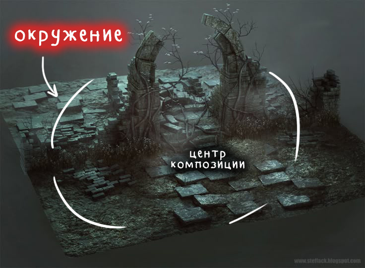 …окружение, ландшафт, земля или совсем пренебрежительно - подставка для миниатюры. Пока мыслить такими категориями, шанс создать что-то более-менее красивое в художественном плане вряд ли выйдет. Сейчас речь не идет о игровой миниатюре или о классическом моделизме, там действительно основание — это лишь фон работы чаще всего. Поговорим о том, где окружение действительно может быть значительной (вернее значимой) частью работы – это диорамы, виньетки, и возможно бюсты. Первая задача окружения – создание требуемой атмосферы, настроения. К примеру, если требуется мрачный сеттинг для главного героя злодея – можно использовать острые угловаты формы, и агрессивные цвета. Так же окружение способно даже отчасти рассказать историю или показать эмоцию, вернее ее усилить или дополнить (как мы и говорили ранее в статьях). Вторая задача окружения – композиционная. Создать со всеми объектами работы, единое полотно. Или создать взаимодействие окружения и главного объекта. Например, болото, из которого