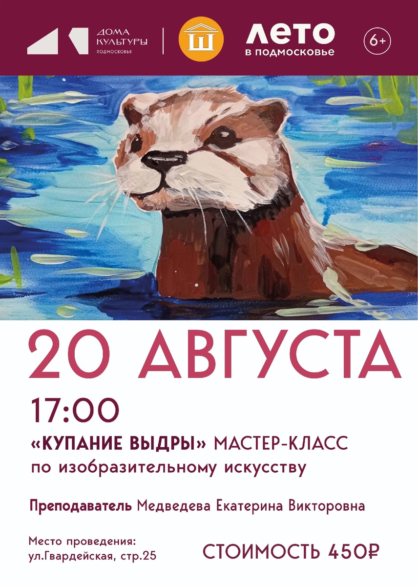 ✨ 🦦 Водные процедуры - полезное для здоровья занятие! Особенно эту идею поддерживают очаровашки-выдры, которые даже спать предпочитают в воде 😄 Шаховский СДК приглашает на очередной творческий мастер-класс, где можно нарисовать этого симпатичного зверька! 😍 ❗КОЛИЧЕСТВО МЕСТ ОГРАНИЧЕНО, на занятие ведется предзапись (обращайтесь к сотрудникам СДК) 🎨 Снова и снова - творческих успехов всем! 🚫 Возраст: 6+ 📆 20.08.2025🕒17:00 🏢 Шаховский сельский дом культуры (СДК) 📍 г.о.Домодедово, с.Красный Путь, ул.Гвардейская, д.21 💰 Цена: 450 ₽ ✅ Мероприятия Домодедово https://dzen.ru/id/66f10385cc4c5a16f7b5fb02 http://vk.com/domodedovo_events http://dzen.ru/domodedovo_events