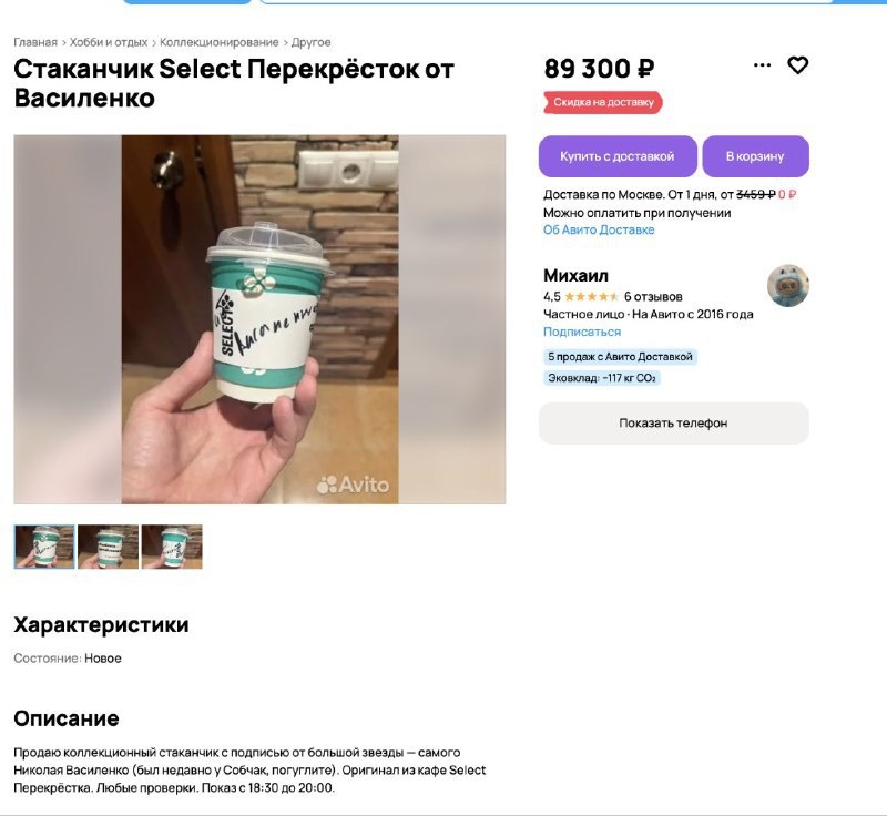 Смешно, но кто-то пытается продать бумажный стаканчик с мероприятия Select Перекрёсток, подписанный Николаем Василенко, за почти 90 тысяч рублей.