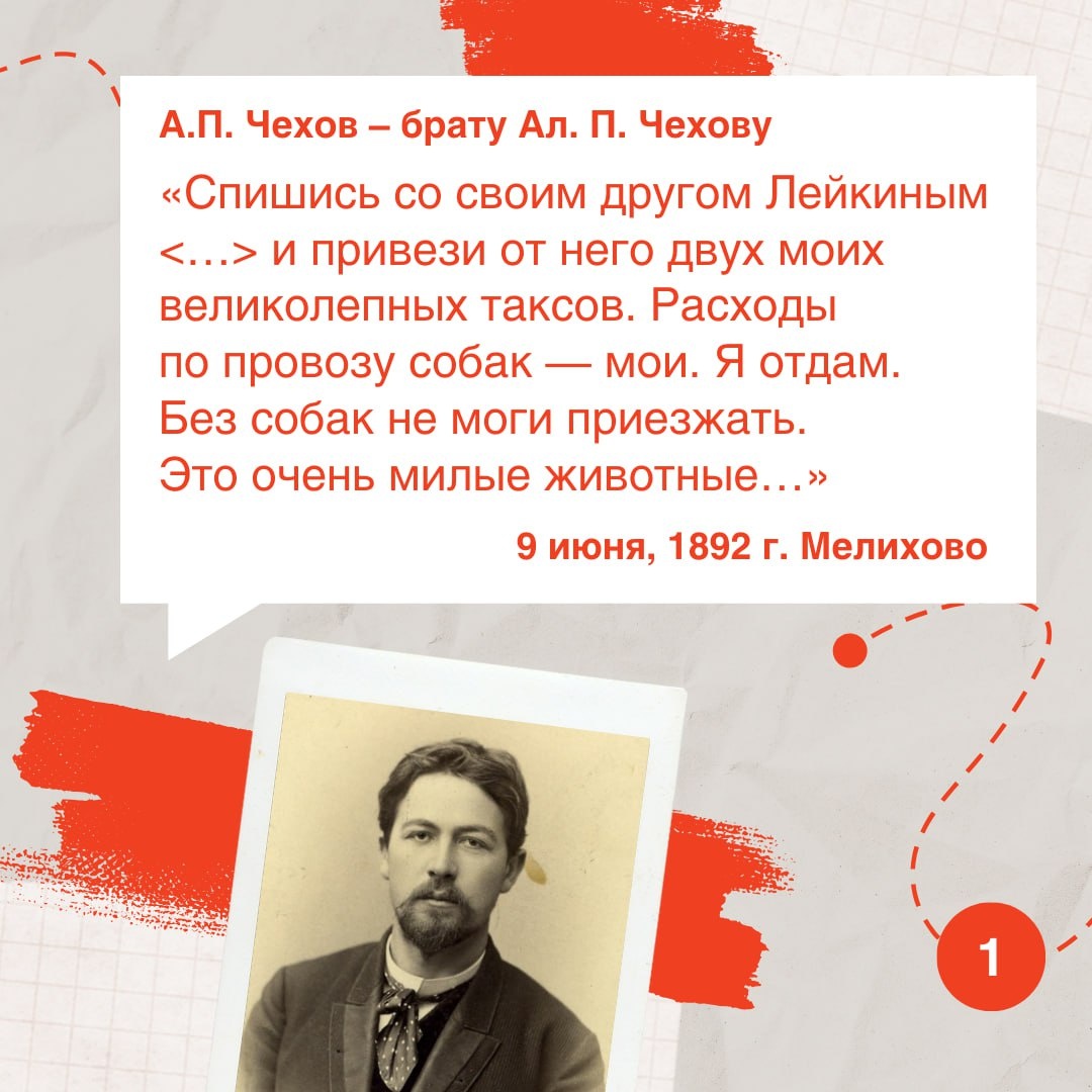 ✨ Приключения БРОМА и ХИНЫ в Мелихове! 🎉 7 сентября в Мелихове состоится ежегодный фестиваль «ТАКСЫ ЧЕХОВА». 🐾 Этот праздник посвящён любимым питомцам Антона Павловича Чехова — очаровательным таксикам Хине Марковне и Броме Исаевичу. Фестиваль проводится ежегодно в честь памяти этих замечательных четвероногих друзей писателя. 📚 Сегодня начинается увлекательная история о жизни и приключениях Хины и Брома. Эта трогательная история началась ещё летом 1892 года, когда Чехов отправил письмо своему брату Александру: ✍️ «Обязательно привези от моего друга Лейкина двух моих прекрасных таксов. Оплату перевозки беру на себя. Приехать без собак ни в коем случае нельзя. Эти собаки такие милейшие существа...» О дальнейших событиях читайте в следующем выпуске! 👉 Прислать новость 💥 Проект "Чехов Детям"