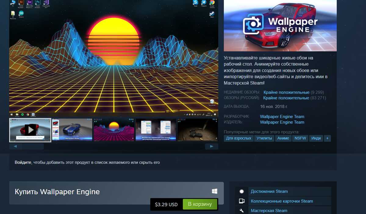 Уже не для кого не секрет что джутсу, подкинул всем свинью, и просит купить подписку jutsu+ за 100-1рубдей. И я подумал, а что можно купить полезного из аниме тематики, что нельзя потрогать и пощупать, а только посмотреть. И в голову мне пришло озарение есть же живые обои Wallpaper engine которые я когда то покупал, давно правда, но это было эквивалентно 100р. Сейчас Но к сожалению ценник вырос, в раза три, но скажу так. Вы покупаете эту программу один раз и на всегда. Да выходит добавьте еще 200 рублей к тем 100р которые вы хотели потрать на джутсу и то бадет больше пользы. Даная программа делает всего лишь одну вещь, она установят живые обои на рабочий стол. Да безусловно, живых обоев бесплатных в интернете много. Но тут есть своя фишка в программе можно не только устанавливать живые обои, но и создавать свои собственные. Также имеются достижения Steam, коллекционные карточки и мастерская. Хотя это и не игра. Вся магия начинается в в Workshop. Здесь мы можем наблюдать огро
