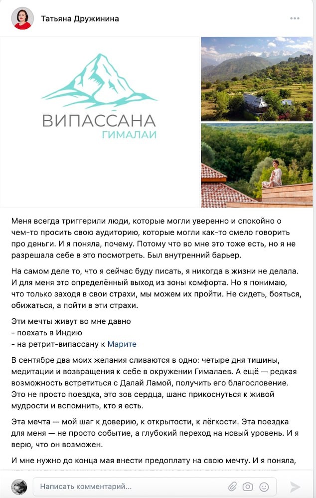 Помню тот день так остро, будто вчера. Сижу я над своим новорождённым курсом «КиноОдиссея». Ни фанфар, ни красной дорожки — только я и мои сомнения, обнявшиеся в темноте. И вдруг — бам! — сообщение. Какая-то девушка хочет купить мой курс. В подарок. Для подруги. Потому что он у неё в вишлисте. Я тогда замерла, как в стоп-кадре. Сердце заколотилось где-то в горле. Мой курс — в чьём-то списке желаний. Я смотрела на экран и плакала. Не от горя. Иногда слёзы — это просто переполненное счастьем сердце, которому нужен выход. С тех пор подобные истории случались чаще. Но тот первый раз — до сих пор со мной. А недавно произошло новое чудо. Таня написала: «Мечтаю попасть к тебе на випассану. Поехать в Индию». Простое сообщение, но в нём было что-то бесконечное. И снова это тепло внутри. Да, есть люди, которые годами медитируют ради невозмутимости. А я… я много медитирую. Но всё равно плачу от таких слов. И у неё не было денег на ретрит. Она честно написала о своей мечте — без гарантии, что
