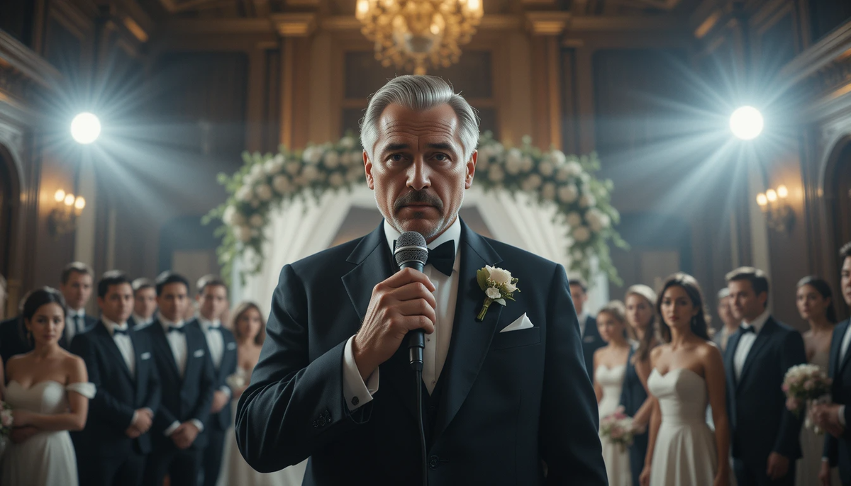 «Минуточку внимания!» – его голос прозвучал твёрдо и громко, без единой дрожащей ноты. Он обвёл всех тяжёлым взглядом. «Прошу прощения за эту неприятную заминку. Многие из вас, наверное, думают, что представление окончено. Но вы ошибаетесь».