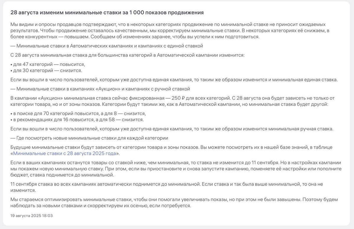 👍 Wildberries меняет минимальные ставки в продвижении с 28 августа Маркетплейс сообщил, что минимальные ставки за 1 000 показов будут пересмотрены. Причина – по текущим минимальным ставкам реклама в некоторых категориях не приносила ожидаемых результатов. Что изменится: 🔹 Автоматические кампании и единая ставка – В 47 категориях минимальная ставка повысится, – В 30 категориях – снизится. 🔹 Кампании «Аукцион» и ручные ставки – Сейчас минимальная ставка фиксирована – 250 ₽. – С 28 августа она будет зависеть от категории и зоны показов. – В поиске: в 70 категориях ставка вырастет, в 8 – снизится. – В рекомендациях: в 16 категориях повысится, в 58 – снизится. 📌 Проверить новые минимальные ставки можно в базе знаний WB (таблица «Минимальные ставки с 28 августа 2025 года»). ⚠️ Важно: – Если у кампании ставка ниже минимальной, до 11 сентября она сохранится. – После этой даты все ставки автоматически поднимутся до минимальных. #WB