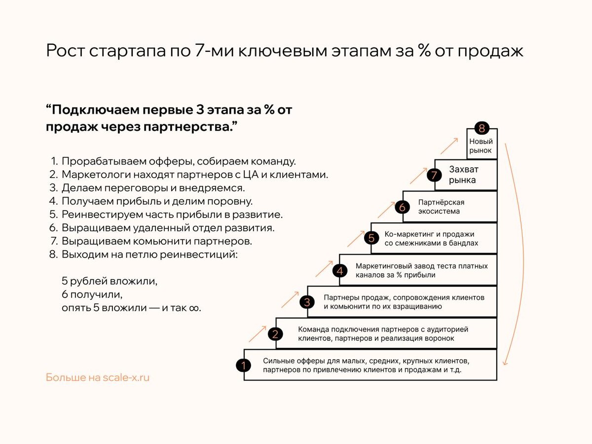 7 ключевых этапов роста B2B SaaS AI продукта Недавно один из фаундеров мне сказал: «Кость, я искал партнёра, способного развернуть это за % от продаж, 2 года — и запрыгнул в поток». Я задумался. Сейчас ведь создать продукт реально намного дешевле, чем раньше. Так пусть и масштабирование будет тоже доступнее! Ведь всем интересно иметь % от хорошей компании за свою работу? Вы заметили эту статистику? (примерные цифры): - 8/10 маркетологов недовольны своими результатами, кейсами и заработком, - 8/10 владельцев баз с аудиториями и клиентами недовольны доходами с них, - 8/10 владельцев новых продуктов недовольны своими продажами. А ведь как минимум 20% из них имеют хорошие активы и нераскрытый потенциал. И вот как мы его реализуем: 1. Маркетологам представим продукты и объединим их в пилотные команды. 2. Они найдут по 100 релевантных владельцев и выведут 5-х на переговоры. 3. Мы продадим идею экологично монетизировать аудиторию на новом продукте. 4. Реализуем запуски, получим прибыл