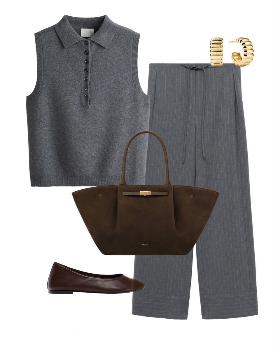 Осень любит благородные фактуры и сложные оттенки. На фото — капсульный сет в духе quiet luxury: холодный графит сочетается с тёплым шоколадом, гладкую вязку поддерживают замша и полированный металл. Такой набор выглядит спокойно, но статусно — его одинаково уместно надеть на работу, свидание или в путешествие.