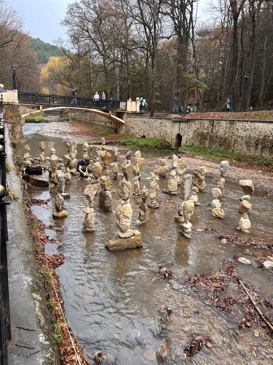 Что необычного посмотреть в Кисловодске? Есть необычное явление, которое можно наблюдать в Кисловодском парке-это балансировка камней. Прямо на Ваших глазах мастер, стоя по колено в воде, укладывает один камень на другой и получаются удивительные сооружения и всё это держится. Люди подолгу следят за процессом, потому что логически объяснить это невозможно, но очень интересно. :)
