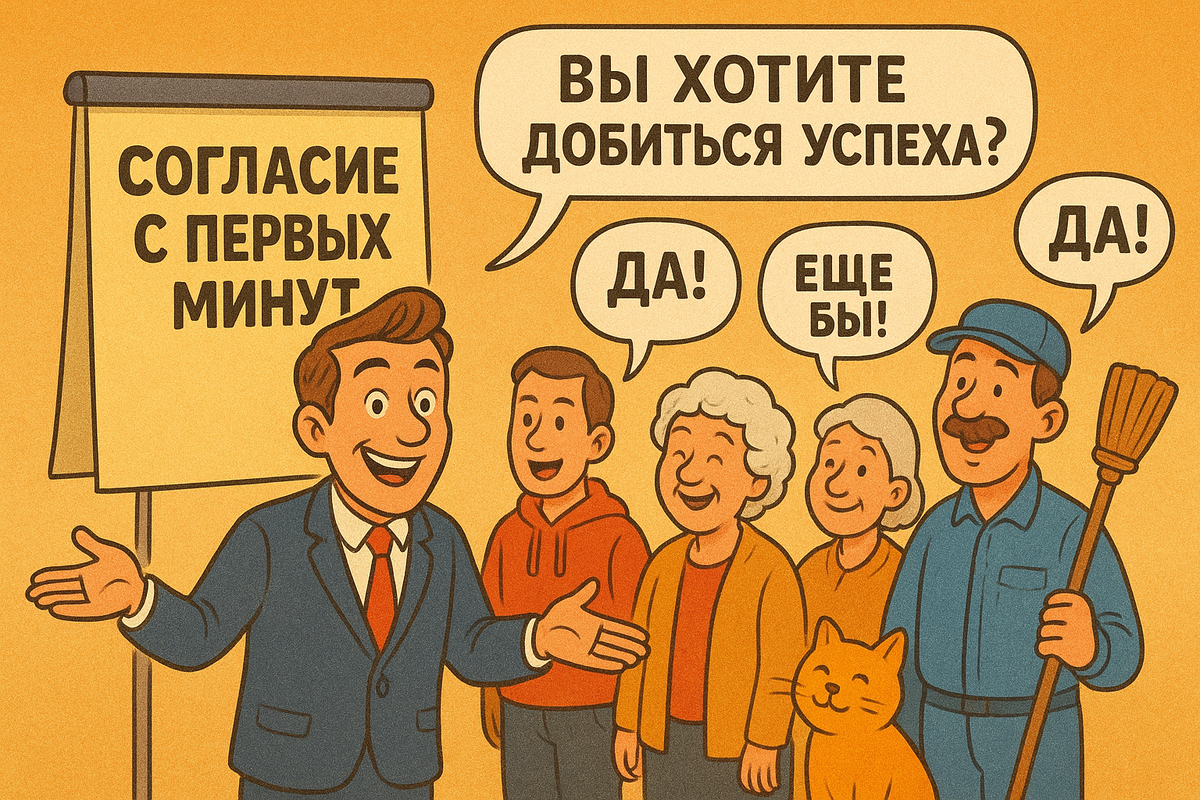Добейтесь согласия с первых минут. Задавайте вопросы или формулируйте мысли так, чтобы аудитория мысленно, а собеседник вслух отвечал «да».