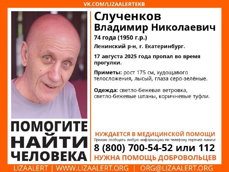 Внимание! Помогите найти человека! Пропал Слученков Владимир Николаевич, 74 года (1950 г.р.) Ленинский р-н, г. Екатеринбург 17 августа 2025 года пропал во время прогулки. Нуждается в медицинской помощи Инфорг: Екатерина (Феникс) 89530530483 @zg66