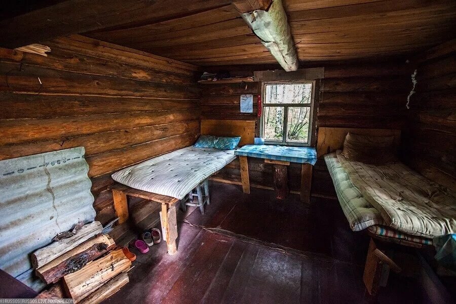 Пространство внутри деревянной избушки делится на две части: жилую зону и кухню-столовую. Первое помещение оборудуется широкой лежанкой-кровати, сооружённой из досок или тонких жердей, покрытых мягким сеном или соломой. Вместо подушки использовали травяные матрасы, наполненные душистыми растениями, такими как чабрец или лаванда.