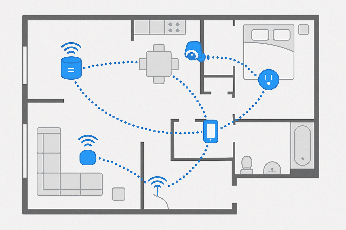 Одна из главных фишек Zigbee в том, что каждое новое устройство в сети не мешает, а помогает. Оно становится «ретранслятором», расширяет сигнал и укрепляет сеть. Это значит, что чем больше у вас датчиков и умных лампочек, тем стабильнее и мощнее работает сеть. В отличие от Wi-Fi, где каждая новая «точка» забирает часть ресурса, Zigbee наоборот — раздаёт его дальше. В итоге сигнал доходит даже в те комнаты, где раньше телефон едва ловил интернет. Для умного дома это критично: свет включается без задержек, датчики движения мгновенно реагируют, а команды на голосовом ассистенте выполняются чётко и без «зависаний». В Wi-Fi всё наоборот: чем больше устройств, тем хуже. Роутер захлёбывается, устройства начинают отваливаться. Сигнал теряется через стены и перекрытия. Именно поэтому при классической схеме «умный дом на Wi-Fi» часто возникают проблемы: свет то включается с задержкой, то вовсе не реагирует, камера подвисает, а датчик движения «теряется» и не передаёт данные. В повседневной жизни