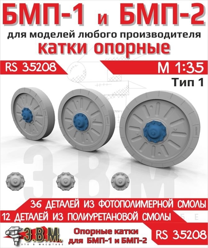 Э.В.М. из Севастополя выпустила набор отлитых из полиуретановой смолы опорных катков для моделей БМП-1 и БМП-2 в масштабе 1/35 с выращенными на 3D-принтере крышками ступиц: Опорные катки БМП-1/2 Тип-1 (каталожный номер RS35208)