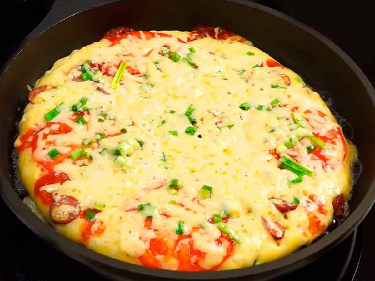 Нам понадобится: Тесто: Мука пшеничная - 0.5 стакана Яйцо куриное - 1 шт. Сметана - 3 ст.л. Майонез - 2 ст.л. Масло растительное - для смазывания сковороды Начинка Колбаса - 100 г Помидоры - 100 г Сыр твердый - 70 г Лук зеленый - 1 перо Кетчуп - 1 ст.л. Соединяем яйцо, сметану, майонез и перемешиваем. Добавляем муку, перемешиваем, чтобы не осталось комочков. Сковороду смазываем небольшим количеством растительного масла. Выкладываем тесто, разравниваем по дну и закрываем сковороду крышкой. Ставим на небольшой огонь, тем временем нарезаем колбасу и помидоры, трем сыр. Как только тесто схватится немного (примерно 3-4 минуты), смазываем кетчупом. Выкладываем кружочки колбасы и по желанию лук. Накрываем колбасу дольками помидор. Посыпаем тертым сыром и возвращаем сковороду на огонь. Готовим под крышкой до расплавления сыра, примерно 6-7 минут. Наша пицца, приготовленная за 10 минут на сковороде, готова. Приятного аппетита!