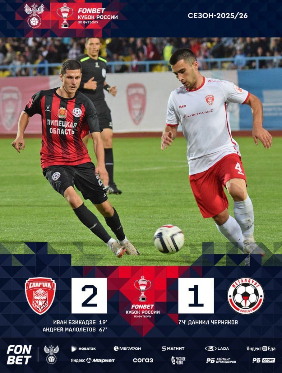 Завершился матч второго раунда пути регионов Кубка России по футболу между командами «Спартак Тамбов» и липецким «Металлургом». Встреча, проходившая в Тамбове, закончилась победой хозяев со счетом 2:1. Уже на 19-ой минуте Иван Бзикадзе открывает счет в матче, а на 67-ой Андрей Малолетов точным ударом удваивает преимущество хозяев поля, после чего «Металлург» перехватил инициативу в свои руки, но смог отыграть лишь один мяч на 74-ой минуте - отличился Даниил Черняков. Для «Металлурга» эта игра стала последней в нынешнем розыгрыше Кубка России, команда завершает свой путь в турнире. Теперь команде предстоит полностью сосредоточиться на выступлениях в чемпионате. Напомним, что следующий матч футбольный клуб «Металлург» сыграет в рамках второго дивизиона лиги «Б» у себя дома против «Арсенала-2» из Тулы. Эта встреча запланирована на 24 августа, начало в 17:00 по местному времени.