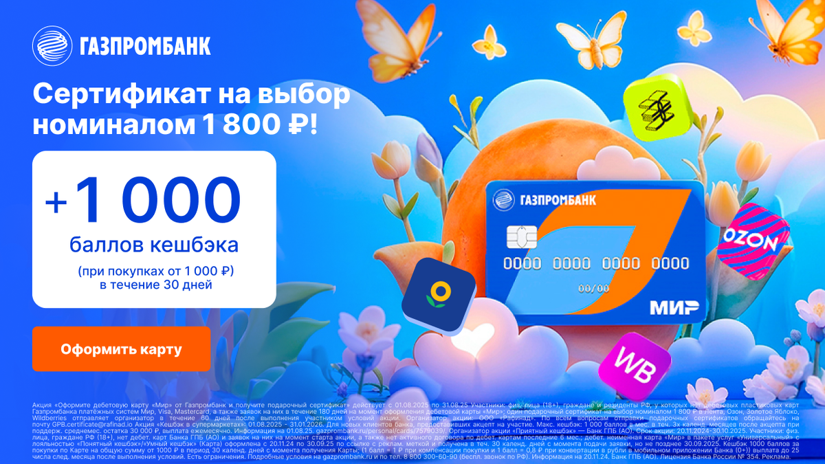 1. Оформляем бесплатную дебетовую карту Газпромбанка по акционной ссылке 2. Совершаем первую покупку в течение 30 дней после активации. 3. Получаем сертификат 1800₽ на Золотое Яблоко,Wildberries, Яндекс Маркет или Ozon в подарок! 💳 Если первая покупка от 1000₽, получаем ещё 1000 кешбэка. 1 балл = 1₽ при компенсации покупок или 0.8₽ при обмене на рубли. При среднемесячном остатке до 9,999.9₽ курс 1 балл = 0.5₽. *Акция
