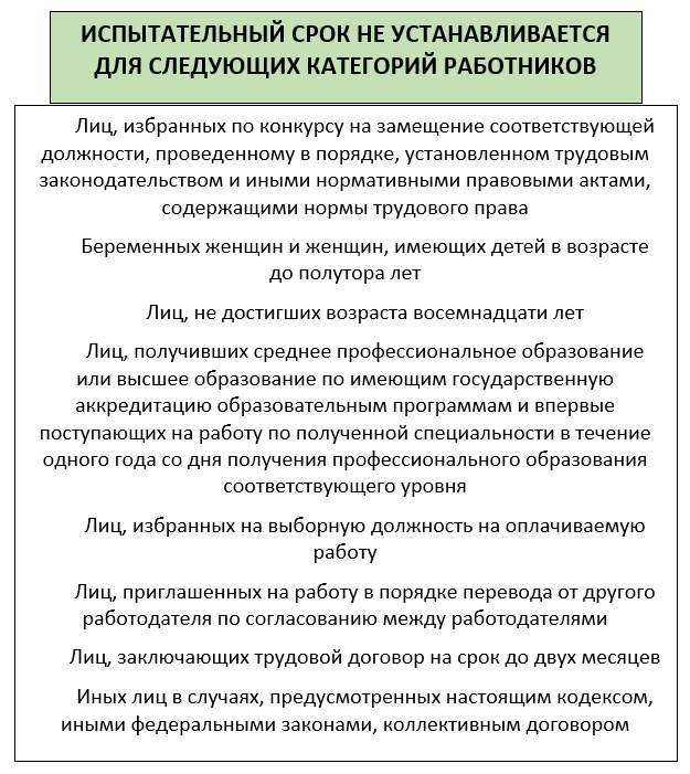 При приеме на работу работодатель может установить для работника испытательный срок. Такое право дает ему ст. 70 Трудового кодекса РФ. Речь идет именно о праве, так как если работодатель имеет желание установить испытательный срок, это должно быть прописано в трудовом договоре. В случае допущения до работы без оформления трудового договора условие об испытательном сроке должно быть оформлено отдельным соглашением. Если ни в трудовом договоре, ни в отдельном соглашении нет условия об испытательном сроке, значит считается, что он не установлен. Подробнее об испытательном сроке при приеме на работу мы писали в статье. Испытательный срок не устанавливается для следующих категорий работников. Закон ограничивает срок испытания тремя месяцами для рядовых работников и шестью месяцами для высшего административного состава. Если же трудовой договор заключен на срок от двух месяцев до полугода, то и срок испытания сокращается до двух недель. Как составить срочный трудовой договор, читайте здесь.