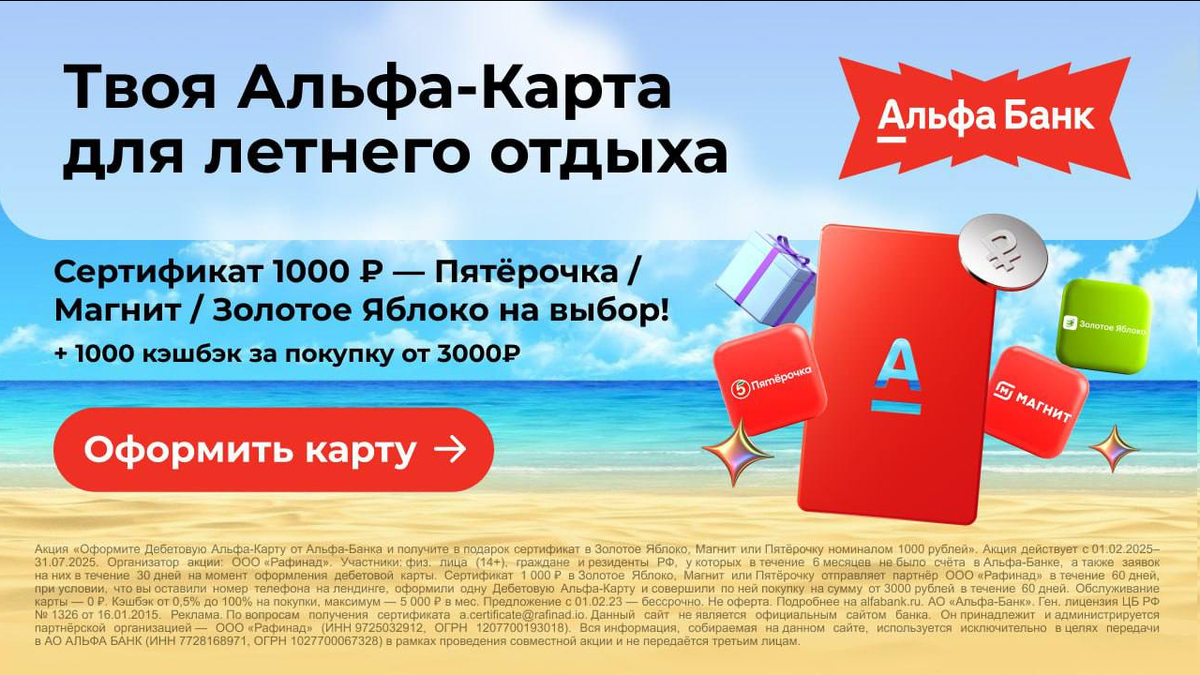 Что нужно сделать? 1️⃣Перейти по ссылке 2️⃣Оформить дебетовую Альфа-Карту 3️⃣Потратить от 3000₽ в течение 60 дней 🎁 Сертификат придёт в SMS — ты сам выберешь магазин: 🍏 Золотое Яблоко 🧲 Магнит 5️⃣ Пятёрочка ⚠️ Только для новых клиентов — без действующих или закрытых дебетовых карт за последние 6 месяцев. 👉 Забрать бонус