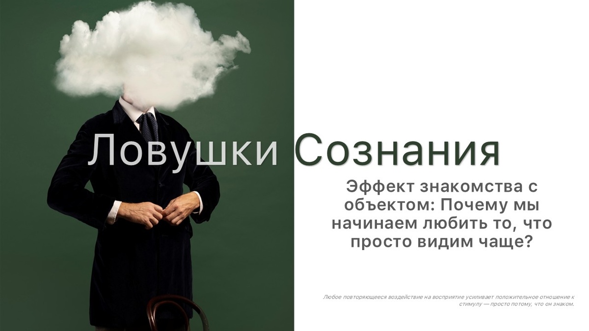 Привет, друзья! Сегодня на канале «Ловушки Сознания» поговорим об эффекте знакомства с объектом — явлении, которое объясняет, почему мы чаще выбираем то, что нам знакомо. Знакомо чувство, когда вы неожиданно начинаете нравиться какой-то песне, которую раньше просто не замечали? Или почему вы чаще покупаете тот же шампунь, хотя пробовали и другие? Давайте разберёмся, как это работает. Представьте ситуацию: вы проходите мимо кафе каждый день. Сначала оно вас не привлекает, но через пару недель вы вдруг заходите туда и думаете: «А тут уютно!» Хотя, по сути, ничего не изменилось — просто вы стали его "регулярным гостем" в своём сознании. Это и есть эффект знакомства с объектом. Он заключается в том, что мы склонны испытывать симпатию к тем людям, вещам или идеям, которые нам знакомы — даже если на них нет никаких объективных причин. Феномен был впервые описан психологом Робертом Зайонцем в 1968 году. В своей работе "Attitudinal Effects of Mere Exposure" («Эмоциональные эффекты простого воз