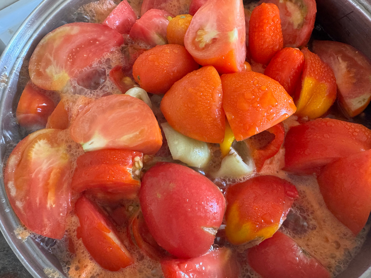 Да-да, я помню, что обещала рецепт томатной пасты без выпаривания! В прошлом году снимала короткий вертикальный ролик, но в личных сообщениях часто просят именно текстовый вариант. Хотя это сложно назвать непосредственно рецептом, скорее технология приготовления :-) Мы таким способом готовим домашнюю томатную пасту уже года 4, как переехали в свой дом. Было много экспериментов, сейчас уже процесс отлажен и занимает минимум времени. Итак, первое, что мы делаем - нарезаем томаты дольками, достаточно крупными. Мы предпочитаем готовить пасту из крупных мясистых салатных томатов, но на самом деле это совершенно непринципиально, томаты могут быть любого размера. Добавляем стакан воды на большую кастрюлю (5-6 литров). Делаем это для того, чтобы томаты не подгорели на дне кастрюли. Доводим до кипения и убавляем. огонь. На медленном огне варим минут 20. Главное, чтобы томаты стали мягкими, в том числе и "попки". Потом откидываем томаты на дуршлаг. Всю жидкость сливаем. Я ее использую для осно
