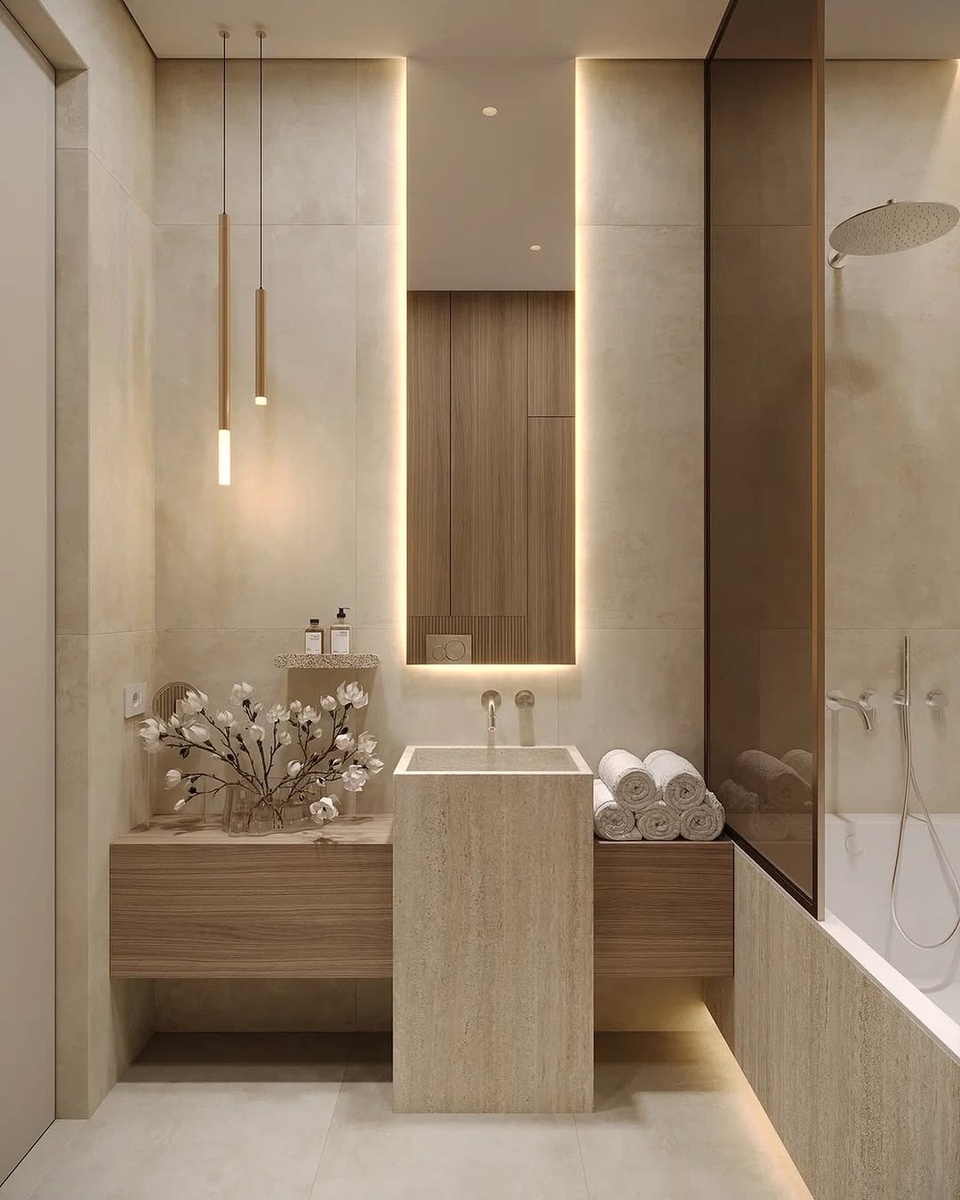 Современный дизайн ванной — это не только про функциональность, но и про ощущение уюта и спа-атмосферы дома. В проекте AX Interiors идеально сочетаются минимализм, тактильность натуральных материалов и тонкая работа со светом. Давайте разберём детали. Вертикальная композиция с подсветкой вокруг зеркала — ключевой элемент этого интерьера. Оно создаёт мягкое, рассеянное свечение, визуально увеличивает пространство и придаёт глубину. Такой приём делает рутину (умывание, уход за кожей) комфортной и превращает ванную в атмосферное место для релакса. Совет: выбирайте тёплый свет 3000К, он максимально приближен к естественному и делает интерьер уютным. Ванна встроена в монолитную каменную конструкцию — решение, которое объединяет зону купания с общим стилем комнаты. Стеклянная перегородка с лёгким оттенком сохраняет воздух и визуальную лёгкость, а потолочный душ добавляет ощущение SPA. Совет: если позволяет планировка, выбирайте встроенные смесители и душевые системы — они выглядят чище и с