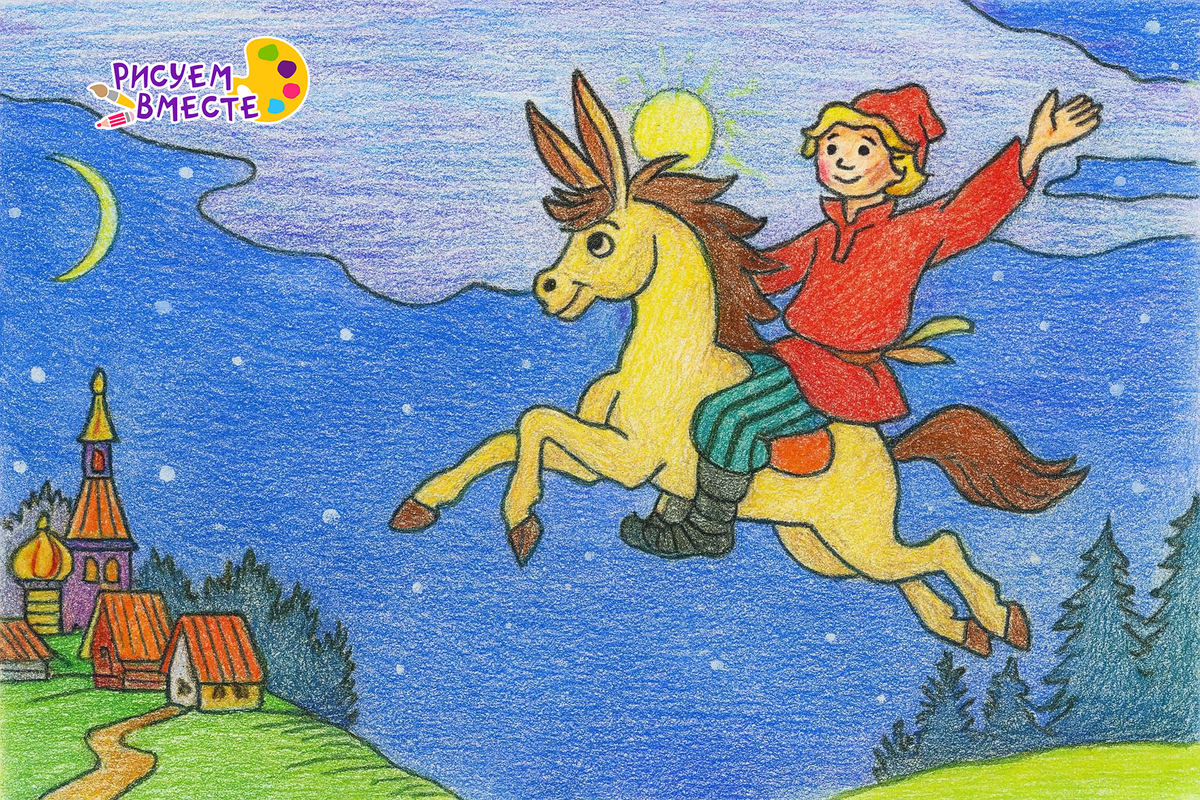 Детский рисунок цветными карандашами — Иван на Коньке-Горбунке летит по ночному небу над деревней и лесом. Русские народные сказки — неисчерпаемый источник вдохновения для творчества. Рисунок «Конёк-Горбунок» — это не просто художественное занятие, а погружение в сказку. Он развивает воображение, знакомит с культурой и помогает детям учиться рисовать. Попробуйте вместе с ребёнком нарисовать Горбунка, смотрите идеи рисунков на нашем сайте - https://risovanie24.ru/stati/tpost/o88hko5r01-konyok-gorbunok-risunok-idei-dlya-detei