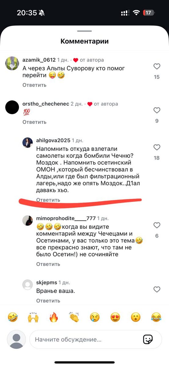 В ответ на пост #нампишут известный в Ингушетии общественник и бывший депутат Мадина Ахильгова обвиняет осетин в бомбежках Чечни и создании фильтрационных лагерей для чеченцев. При этом она же ранее рассказывала как сильно хотела вступить в партию «Единая Россия». Комментарий @OssetiaFB: «К сожалению, ингушские националисты видят в доброжелательных или даже нейтральных отношениях между Чечней и Осетии угрозу для себя, поэтому распространяет мифы и небылицы, чтобы поссорить два народа. Уже 25 лет ингушская сторона распространяет миф о „бесчинствах осетинского ОМОНа в селении Новые Алды“, но эта ложь давно разоблачена. Можно лишь сожалеть, что, в то время как простые ингуши в составе казачьих подразделений проливают кровь за Россию на фронте, некоторые ингушские общественники расшатывают обстановку у них в тылу».