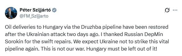 В ответ на пост UPDATE: Hungarian FM Szijjarto confirms Druzhba pipeline fixed Thanks Russian deputy energy sec for rapid restoration after Ukrainian attack ‘This is not our war. Hungary must be left out of it!’