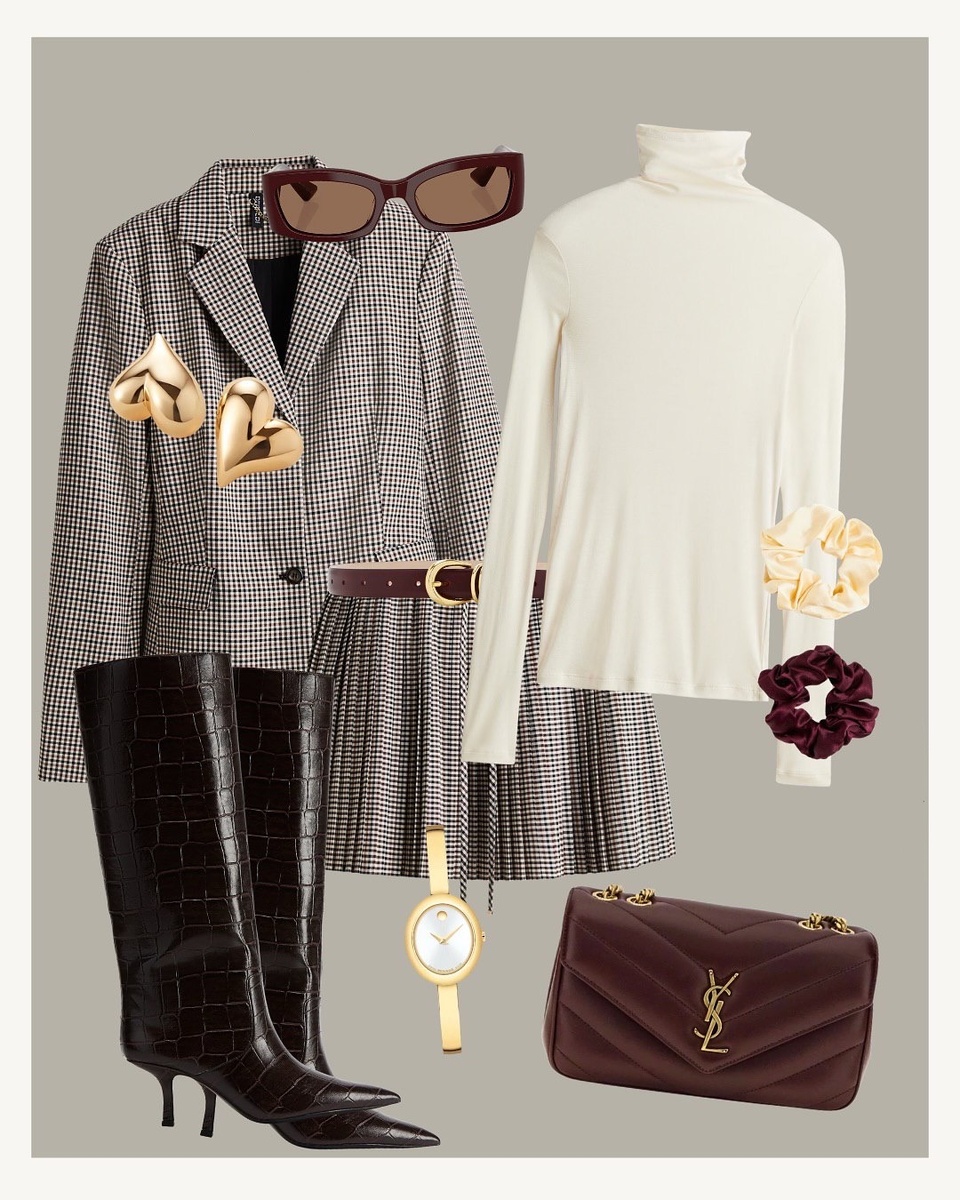Этот «modern preppy» — универсальная формула осени: клетка + молочный нижний слой + высокие сапоги + бордовый акцент. Лук элегантен днём и соблазнителен вечером, тёплый, практичный и безвременно стильный. Сыграйте на длинах и фактурах, подберите металлы под одну гамму — и ваш образ будет выглядеть так, будто вы только что вышли со съёмки модного журнала.