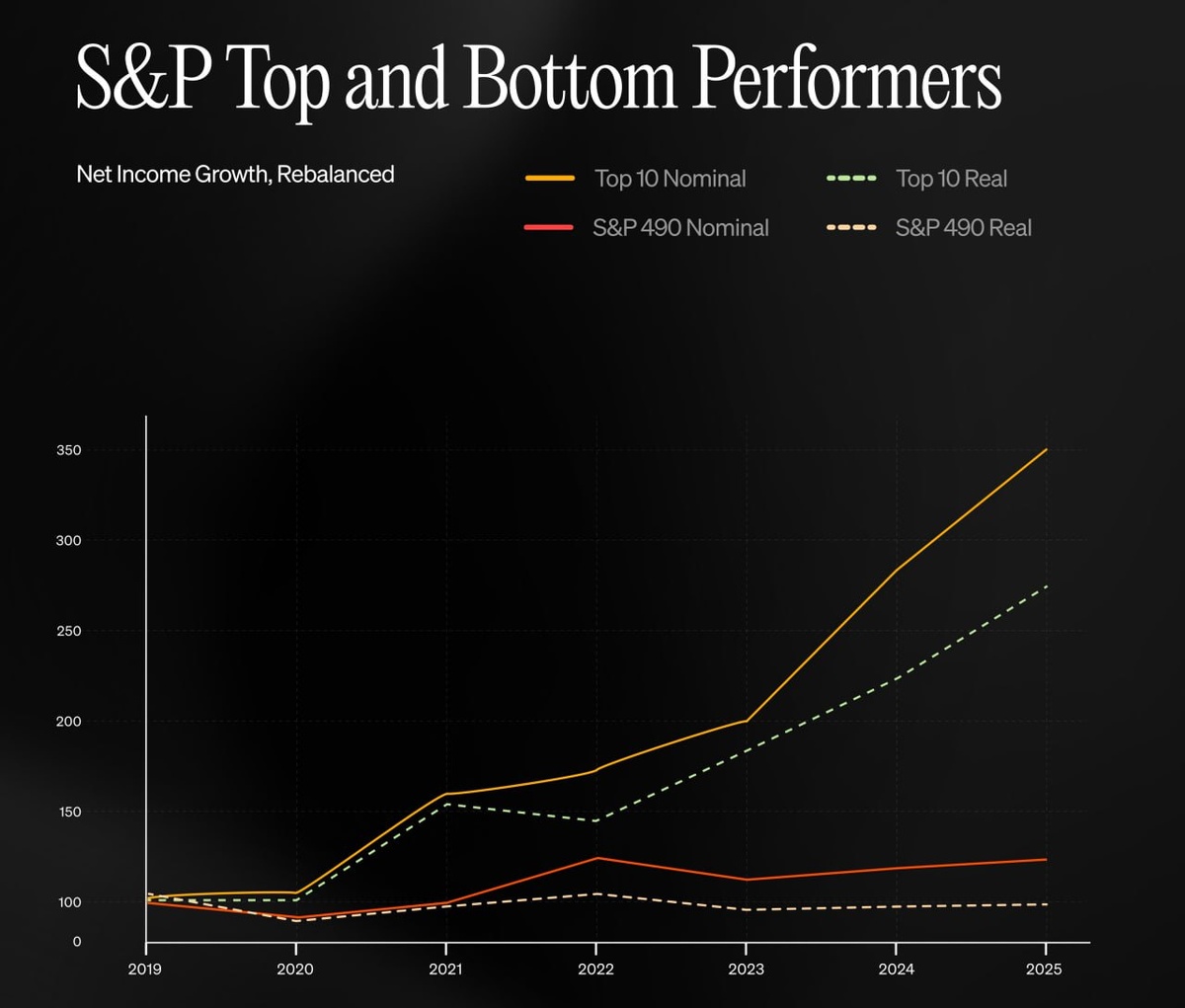 The S&P 500 is turning into a “Top 10 Index”! 📊 Since 2019, the earnings for the top 10 stocks have skyrocketed over 250%, while the other 490 have barely moved. 🥱 In 2023, giants like MSFT, AAPL, and NVDA have been the only ones flexing their gains while the rest stayed stuck in neutral. 🚀 This concentration is wild — it’s like the market’s putting all its eggs in one basket! 😬 If even one of these top players stumbles... yikes!