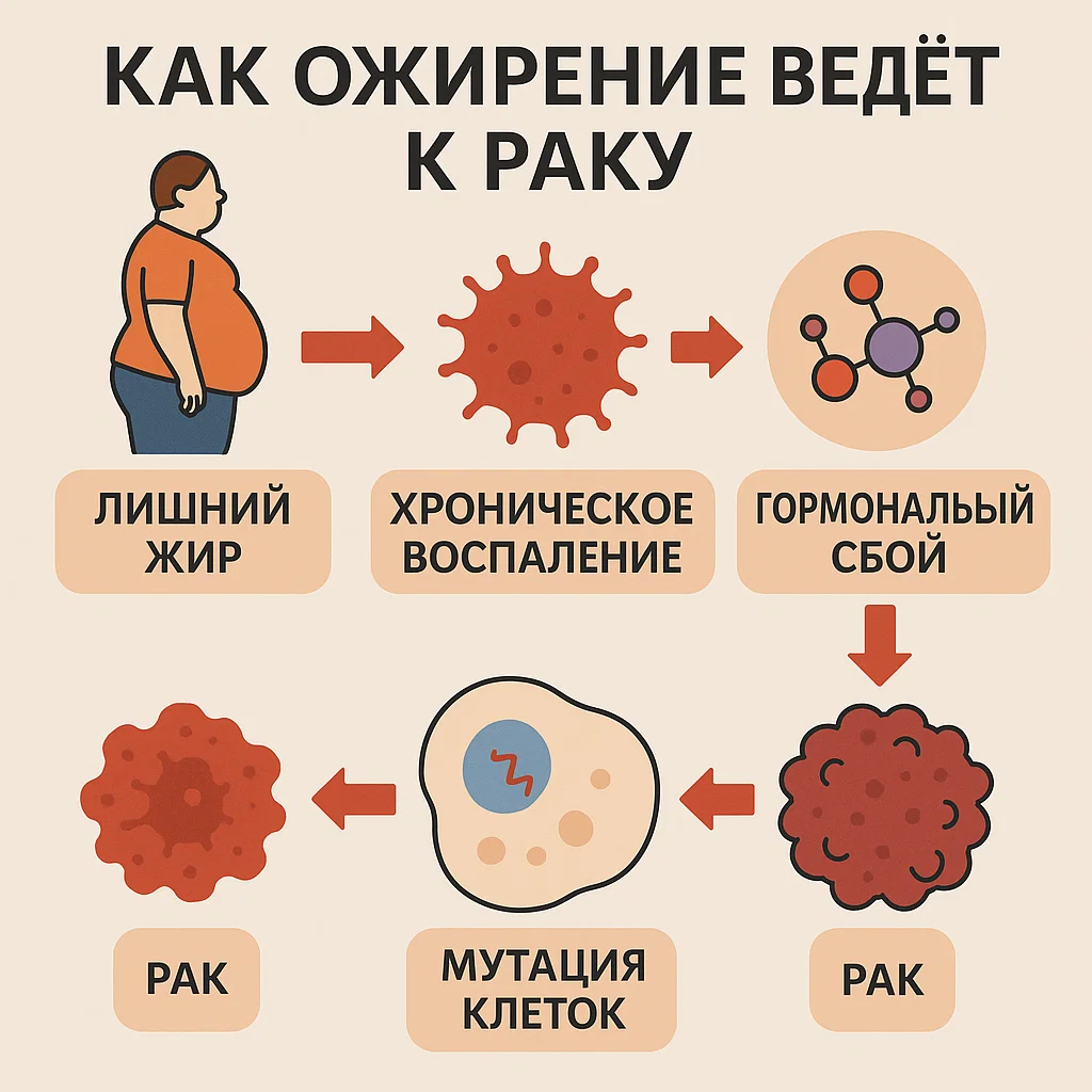 В основе любого онкологического заболевания лежит воспаление. У людей с избыточной массой тела в организме постоянно поддерживается вялотекущий воспалительный процесс. На фоне этого воспаления клетки начинают делиться неправильно, мутировать. Иммунная система, перегруженная борьбой с последствиями ожирения, перестает справляться с уничтожением этих “неправильных” клеток, и риск возникновения опухоли возрастает в разы. Второй механизм — гормональный сбой. Ожирение нарушает баланс гормонов, что напрямую провоцирует развитие гормонозависимых опухолей. Какие виды рака чаще всего связаны с ожирением: Ожирение усложняет лечение