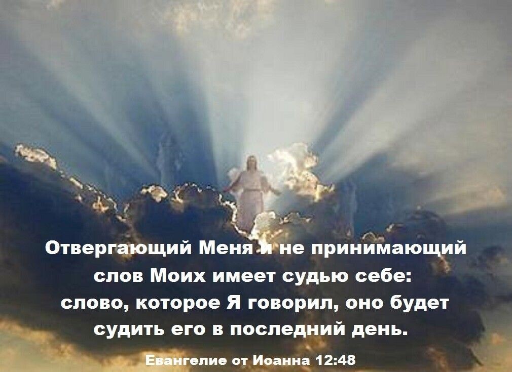 «Иисус же возгласил и сказал: верующий в Меня не в Меня верует, но в Пославшего Меня. И видящий Меня видит Пославшего Меня. Я — свет, пришёл в мир, чтобы всякий верующий в Меня не оставался во тьме. И если кто услышит Мои слова и не поверит, Я не сужу его, ибо Я пришёл не судить мир, но спасти мир. Отвергающий Меня и не принимающий слов Моих имеет судью себе: слово, которое Я говорил, оно будет судить его в последний день. Ибо Я говорил не от Себя; но пославший Меня Отец, Он дал Мне заповедь, что сказать и что говорить. И Я знаю, что заповедь Его есть жизнь вечная. Итак, что Я говорю, говорю, как сказал Мне Отец» (Ин. 12:44-50).