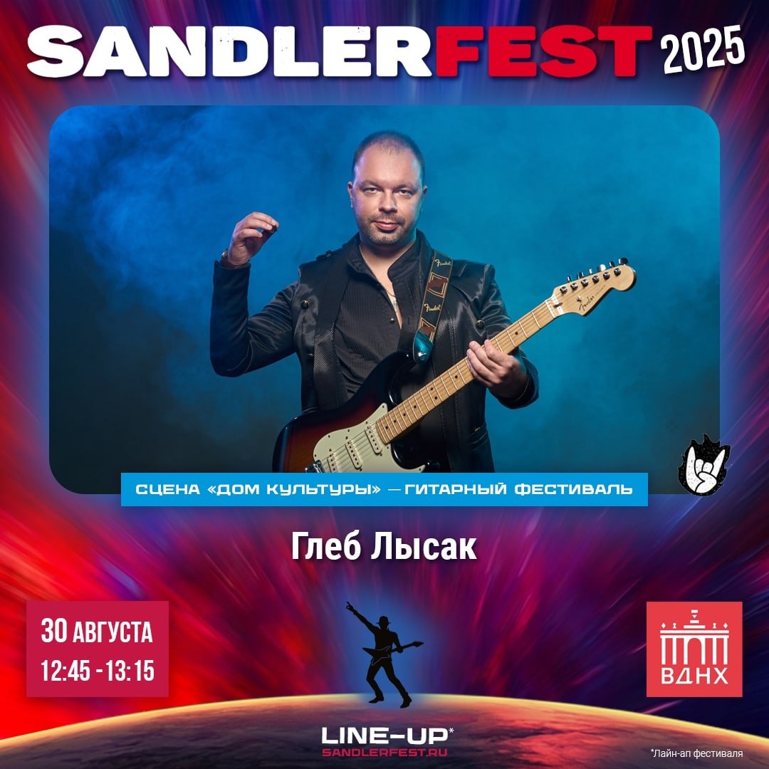 🎸 Глеб Лысак — виртуоз электрогитары на сцене SandlerFest 2025 30 августа на сцене Дом культуры в рамках фестиваля SandlerFest выступит Глеб Лысак — гитарист, композитор, преподаватель и один из самых ярких представителей современной гитарной школы России. 🎶 Глеб — лауреат и дипломант международных и всероссийских конкурсов, соло-гитарист легендарного БКЗ «Октябрьский» в Санкт-Петербурге и эндорсер компании AMT Electronics. Он выступал на крупнейших площадках России и за рубежом, а его преподавательский опыт охватывает школы в ОАЭ, Бахрейне и России. Глеб ведёт занятия на русском и английском, а также развивает собственную авторскую школу обучения игре на электрогитаре. На SandlerFest 2025 прозвучат как авторские композиции с сольного альбома «One Step to Heaven», так и оригинальные обработки классики — всё это в его фирменной манере, сочетающей техничность, вкус и эмоциональную глубину. 📍 Не пропустите его выступление 30 августа на сцене «Дом культуры». Это будет не просто конц