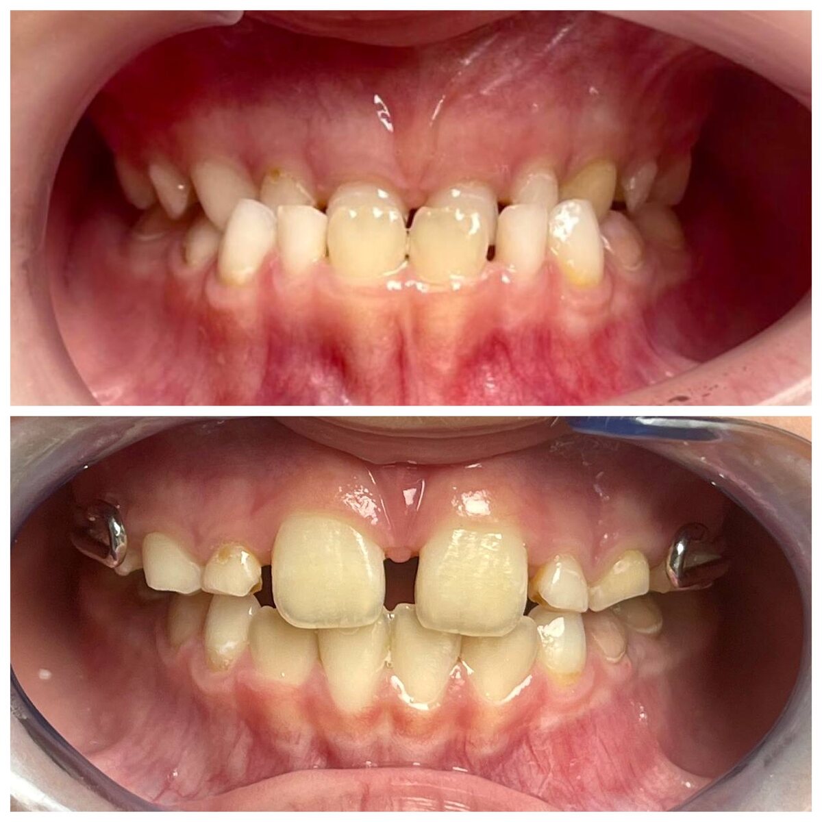 Шикарный кейс! Наверху - фото до. Полный перекрестный медиальный прикус. Внизу - фото на этапе лечения. Перекрест устранен, мезиального прикуса нет. Но видно, что прошло много времени. История такая: как и многим родителям, было тяжело признать наличие единственно правильного варианта лечения. Поэтому год мы потратили на ношение съемной пластинки. Потом благополучно ребенок ее потерял. Результат был, но не такой шикарный. (Вроде есть, а вроде нет, как часто бывает при компромиссах) Спустя год моего активного прогрева и убеждения родителей , мы ставим Марко-Роса и лицевую маску. Ребенок ходит в автобусе в ней и в целом очень рад. Ну и результат мы получаем за месяц 🙌🏻😎