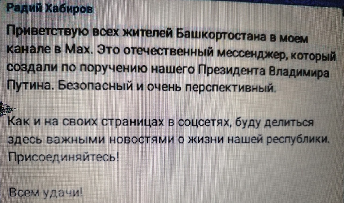 Здесь он поделится опытом работы управленческой команды. Глава республики Радий Хабиров запустил канал в популярном российском мессенджере Max. В нём он будет публиковать актуальные новости, рассказывать о решениях, принимаемых руководством, и о том, как развивается регион. Чтобы подписаться на канал главы Башкортостана в Max, перейдите по ссылке.