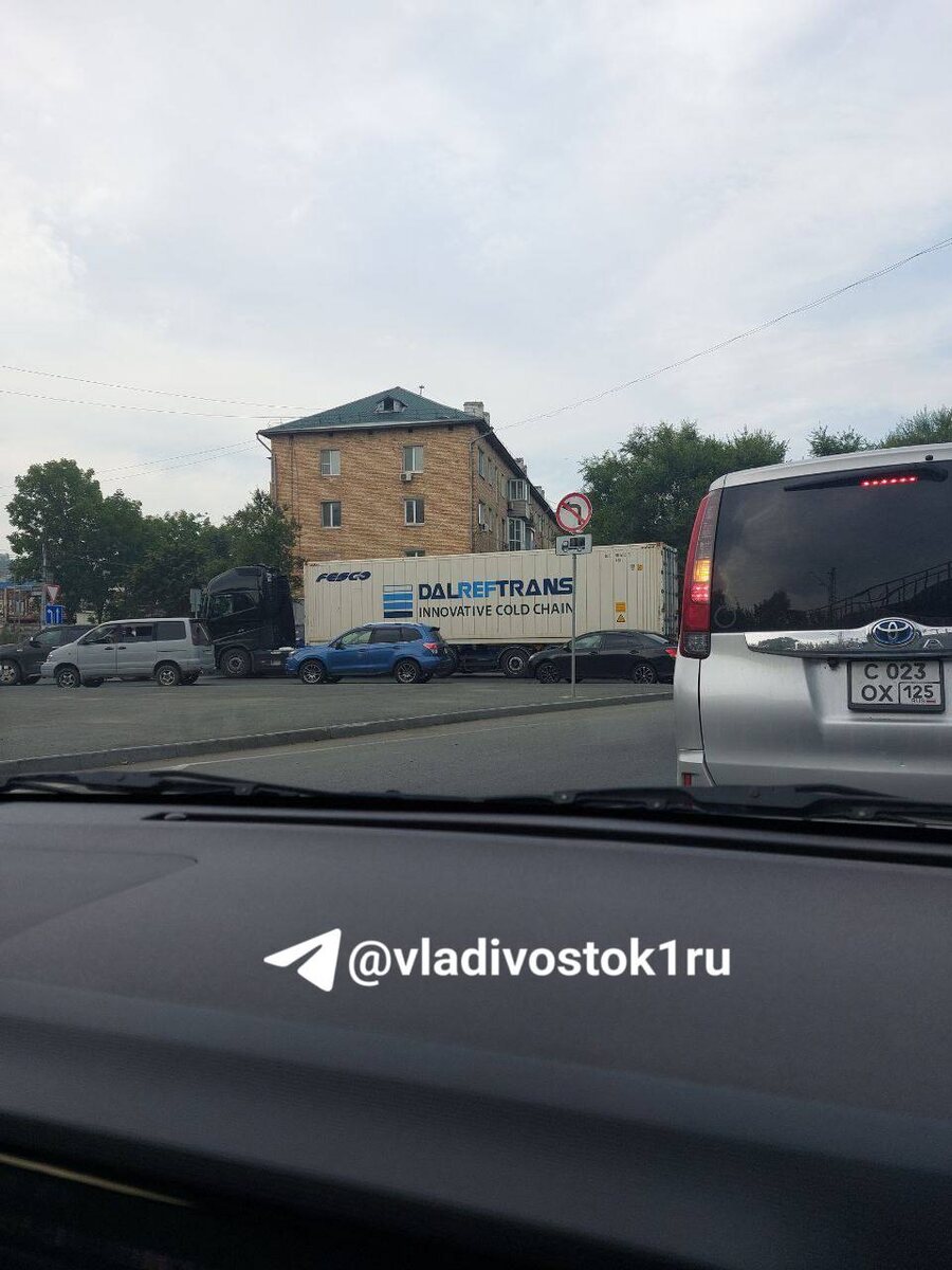 Поворот на Фадеева: большегрузы упорно не хотят верить знакам. Читатель отметил, что такая картина здесь ежедневно и это не один случайный водитель.