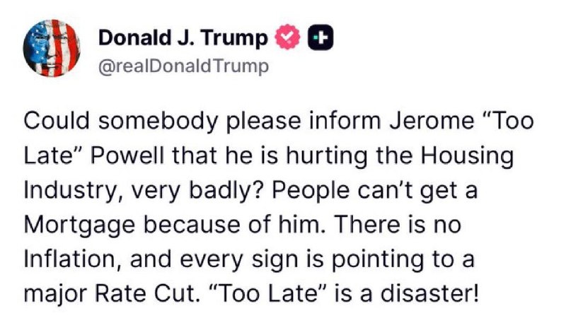 47 STEAM rolls Jerome ’Too Late’ Powell in Truth Social post Saying, ‘he is hurting the housing industry’ ‘There is no INFLATION, And every sign… pointing to… MAJOR RATE CUT’ Agree?