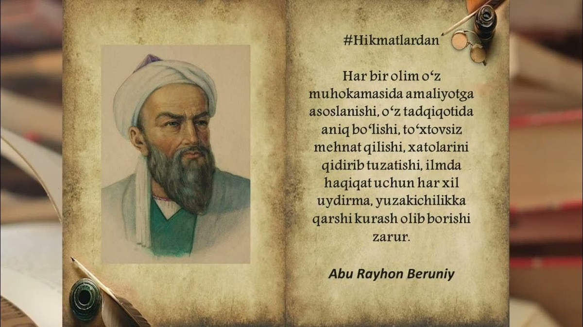 Муродбахш чоршанбада Абу Райҳон Беруний ҳикматлари ▫️Қаламнинг абадий излари бўлмаганда, халқларнинг хабарларини қайдан билар эдик? ▫️Ҳасад билан ғазаб икки қанот бўлиб ҳаракатга келса, тоза ва чиройли ҳаётларни хира ва кудуратли қилиб юборади. ▫️Илм даргоҳига кирар экансан, қалбинг кишини оздирувчи иллатлардан, одамни кўр қилиб қўядиган ҳолатлардан, чунончи, қотиб қолган урф-одатлардан, ҳирсдан, рақобатдан, очкўзликнинг қули бўлишдан озод бўлмоғи даркор ▫️Тенглик ҳукм сурган жойда сотқинлик, алдамчи эҳтирослар, ғам-ғусса бўлмайди. ▫️Ҳатто (деҳқонлар) ойга қараб уруғлар сочиш, экиш, кўчатлар ўтқазиш, пайванд қилиш ва чанглатиш, ҳайвонларни урчитиш ва бошқа вақтларни аниқлайдилар. Каналимизга обуна бўлинг ва энг сўнгги янгиликларни кузатиб боринг Jizzaxnews |Тelegram | Facebook | Dzen | YouTubе