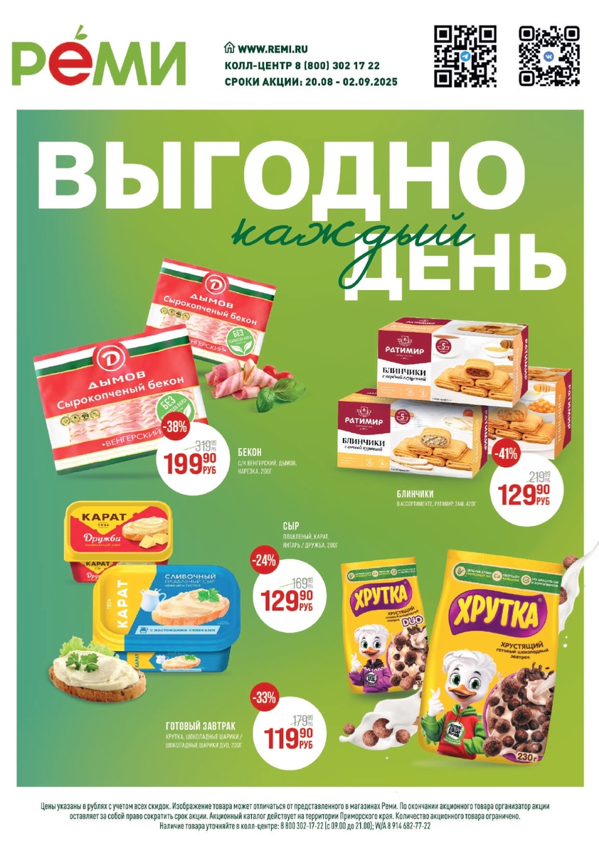 С РЕМИ выгодно каждый день! Ваши любимые покупки – от свежих ингредиентов для приготовления изысканных блюд до эффективных средств для безупречной чистоты вокруг. Крупы, лапша, ароматные приправы, деликатесные колбасы, изысканные сыры и многое-многое другое – выбор огромен! Мы подготовили для вас большой каталог, в котором вы найдёте все необходимое для любых случаев жизни. Планируете ли вы отдых на природе, уютные домашние посиделки с близкими или просто желаете насладиться лёгким перекусом в хорошей компании – у нас есть всё необходимое по самым выгодным ценам С 20 августа по 2 сентября, на собранное в КАТАЛОГЕ, действуют специальные цены. Приходите в РЕМИ и наслаждайтесь выгодными ценами До встречи!