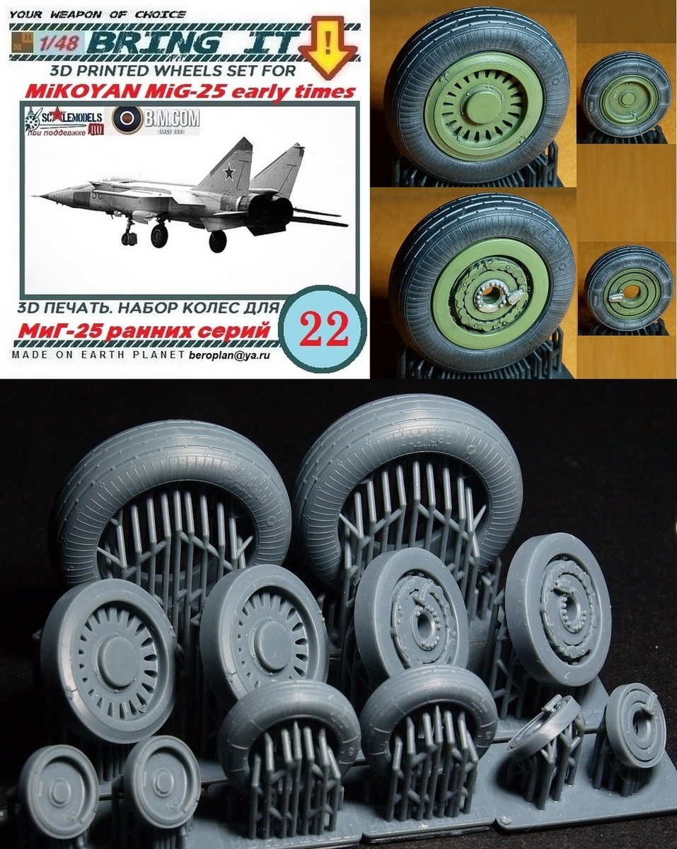 Bring It! из Уфы выпустила на 3D-принтере колеса шасси для моделей МиГ-25 в масштабах 1/48 и 1/72: Для периода 1970-1980 гг. - наборы №22 и №116 с покрышками основных колес "Омскшинзавода". Для периода 1990-2000 гг. - наборы №23 и №117 с покрышками основных колес Барнаульского ЗРТИ.