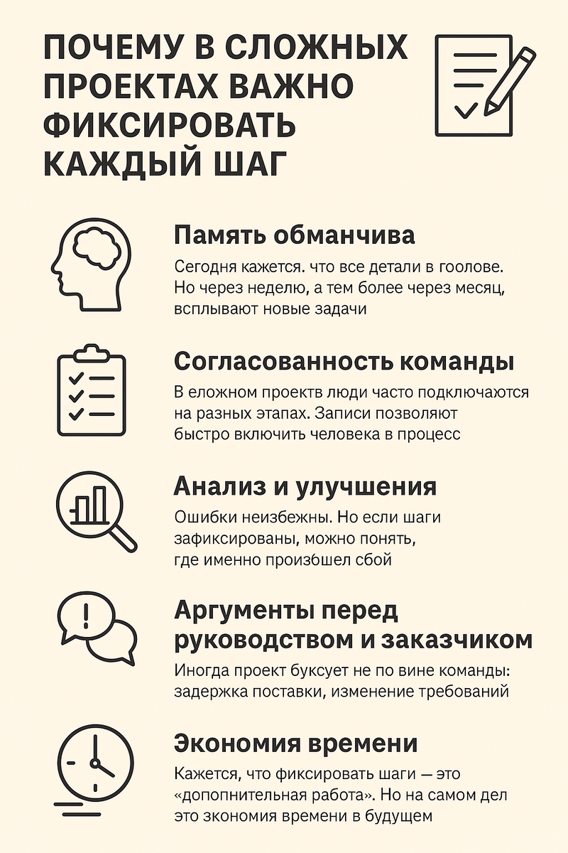 Когда мы работаем над простыми задачами — все кажется очевидным: сделал, передал, закрыл. Но в сложных проектах, где вовлечено много людей, отделов и этапов, отсутствие фиксации каждого шага превращает работу в хаос. За годы управления проектами я убедилась: запись — это не бюрократия, а инструмент выживания. Сегодня кажется, что все детали в голове. Но через неделю, а тем более через месяц, всплывают десятки новых задач, и вспомнить, «что именно решили на том совещании» становится почти невозможно. Фиксация защищает от «я так не говорил» и «мы договаривались иначе». В сложном проекте люди часто подключаются на разных этапах. Если нет общей истории действий, новые участники начинают задавать кучу вопросов или дублировать уже проделанную работу. Записи позволяют быстро включить человека в процесс. Ошибки неизбежны. Но если шаги проекта зафиксированы, можно понять, где именно произошел сбой: на этапе планирования, передачи данных или внедрения. Это дает шанс не наступать на те же грабли.