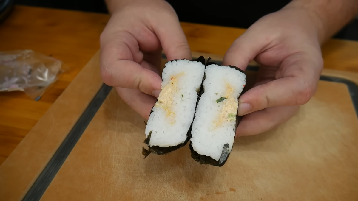 Чтобы докопаться до истины, нам нужно начать с самого начала — с «вещественного доказательства». Я взял один из таких магазинных образцов, чтобы провести его вскрытие. Что ж, давайте посмотрим, что внутри. Я разрезал его, и, как и ожидалось, начинки кот наплакал. Только немного тунца, который больше похож на туман, чем на рыбу. Это возмутительно. Но я не удивлён.