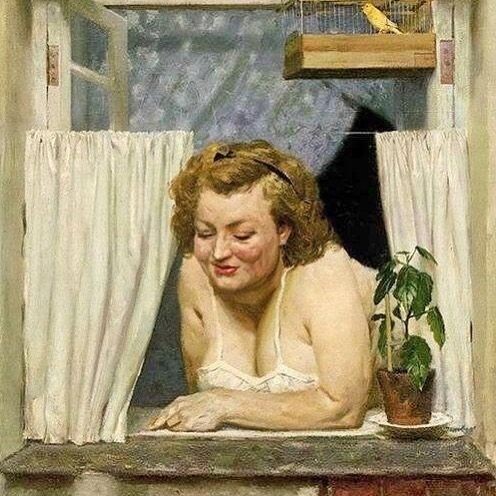 «Моя соседка из дома напротив» — лето. Жаркий день. Женщина, истомленная утренним зноем, выглядывает в окно. Она в полной уверенности в собственной привлекательности — а это её скрытая, едва уловимая сила. Картина замыкается на интимном, тихом моменте, лишённом идеологического пафоса: это не пропаганда, а скромное признание чувственности в обыденном.
