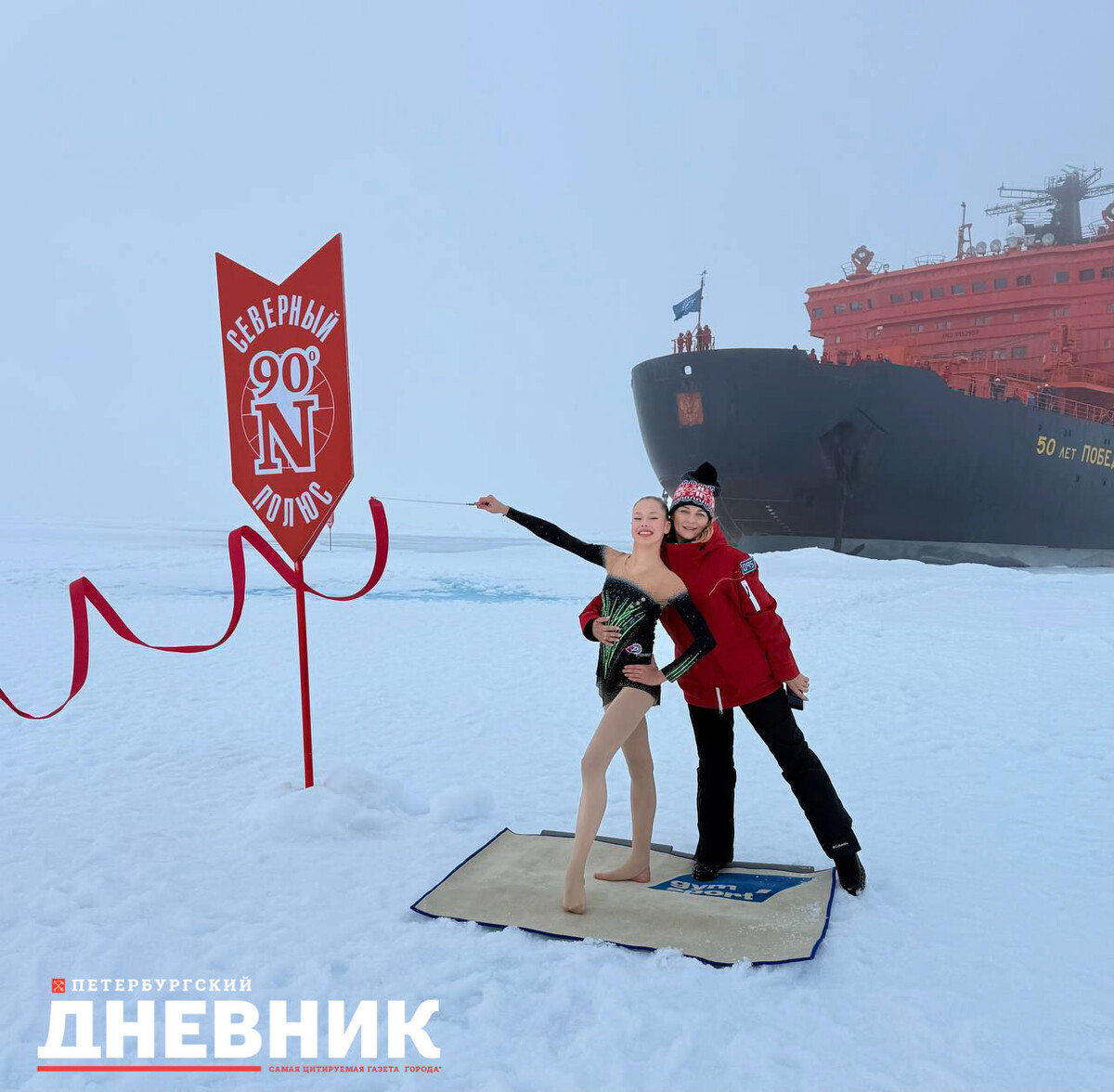Спортсменка из Петербурга Мария Рослякова первой в мире исполнила программу по художественной гимнастике на Северном полюсе. Выступление состоялось в точке схождения меридианов – 90 градусов северной широты – на фоне атомного ледокола «50 лет Победы».